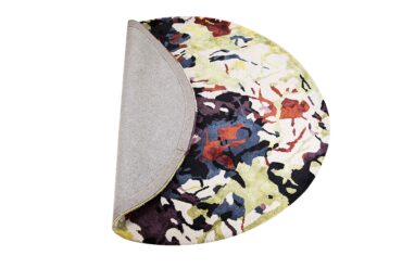 This circular rug showcases a hand-tufted tapestry of wool and viscose, where splashes of red, blue, black, and yellow dance across a cream canvas, creating a vibrant and modern art piece for your floor.