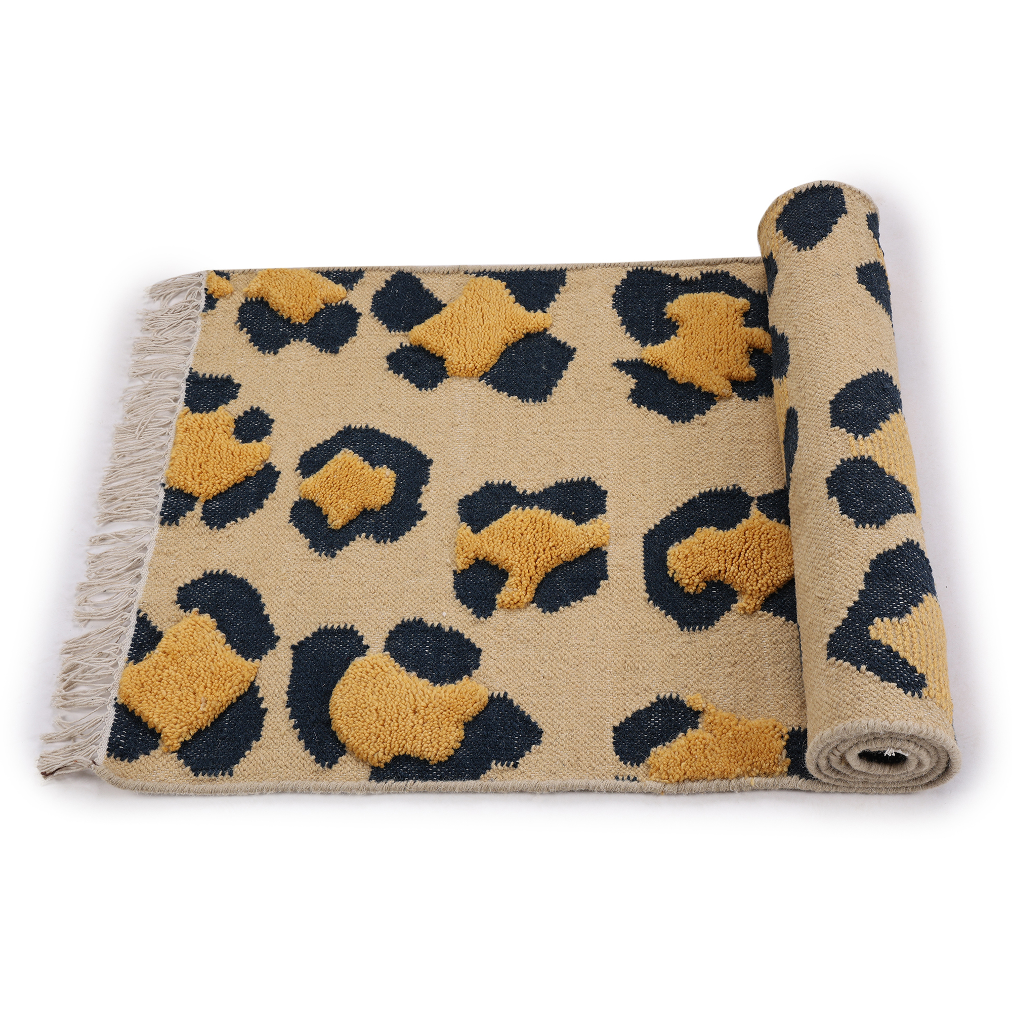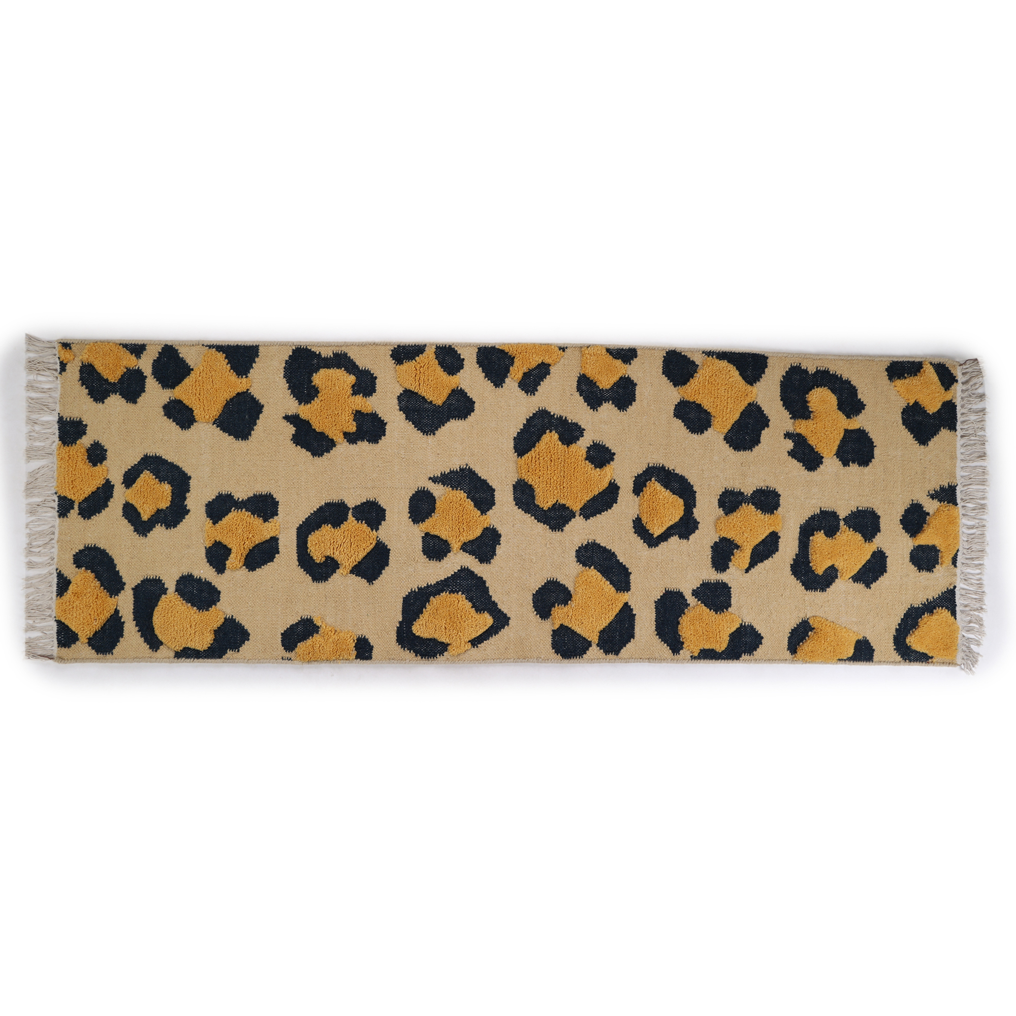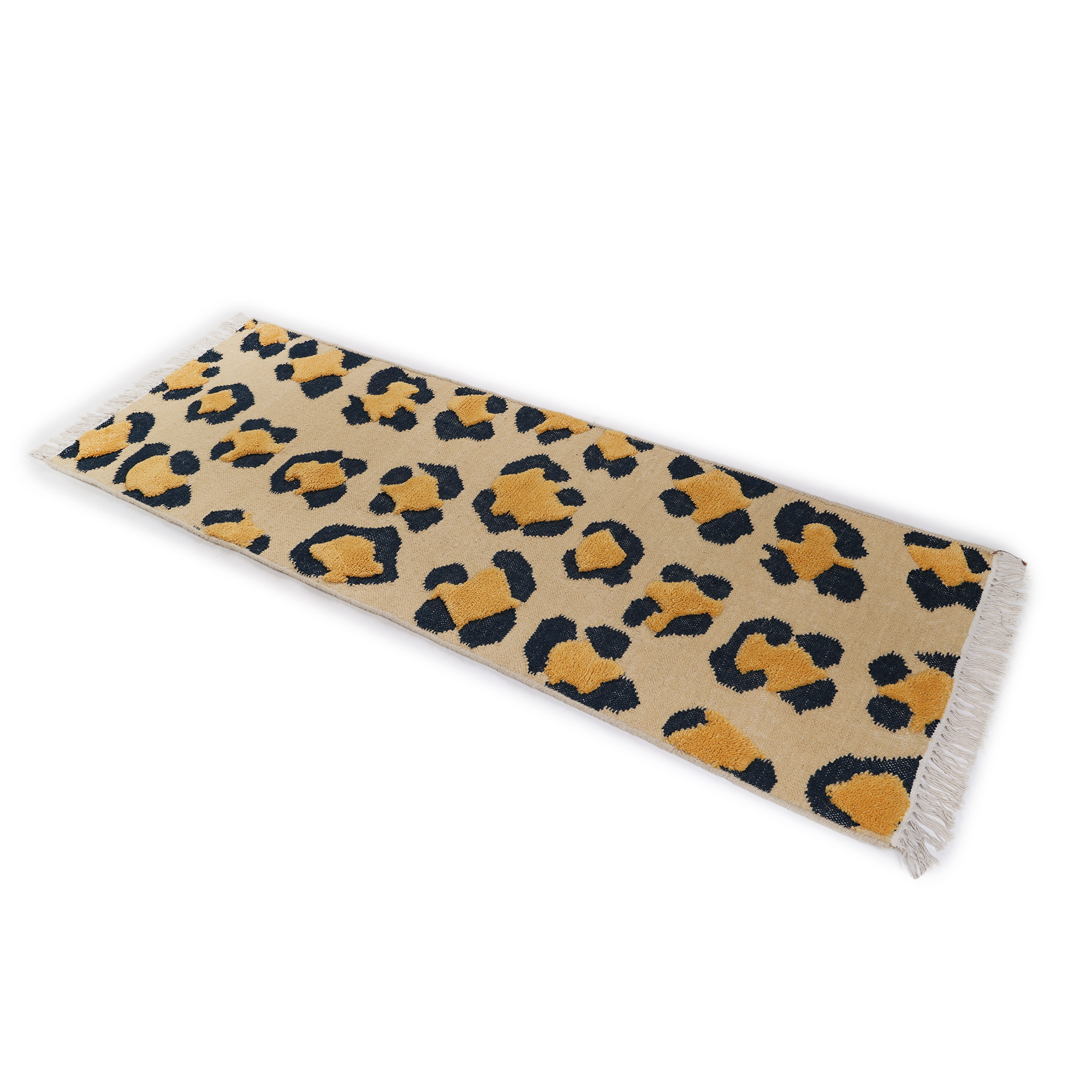 Step into the wild with this handcrafted rug, adorned with a leopard print that captures the essence of the untamed. The beige backdrop and intricate spots, framed by white fringes, make it a striking addition to any interior.