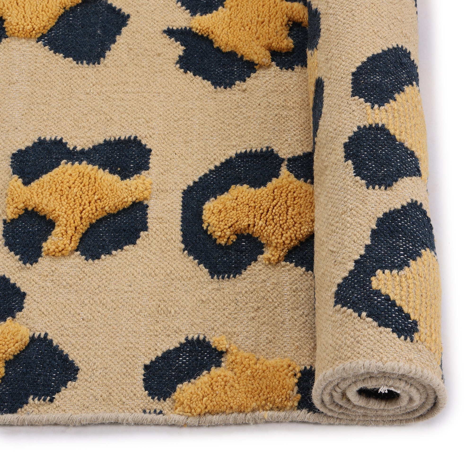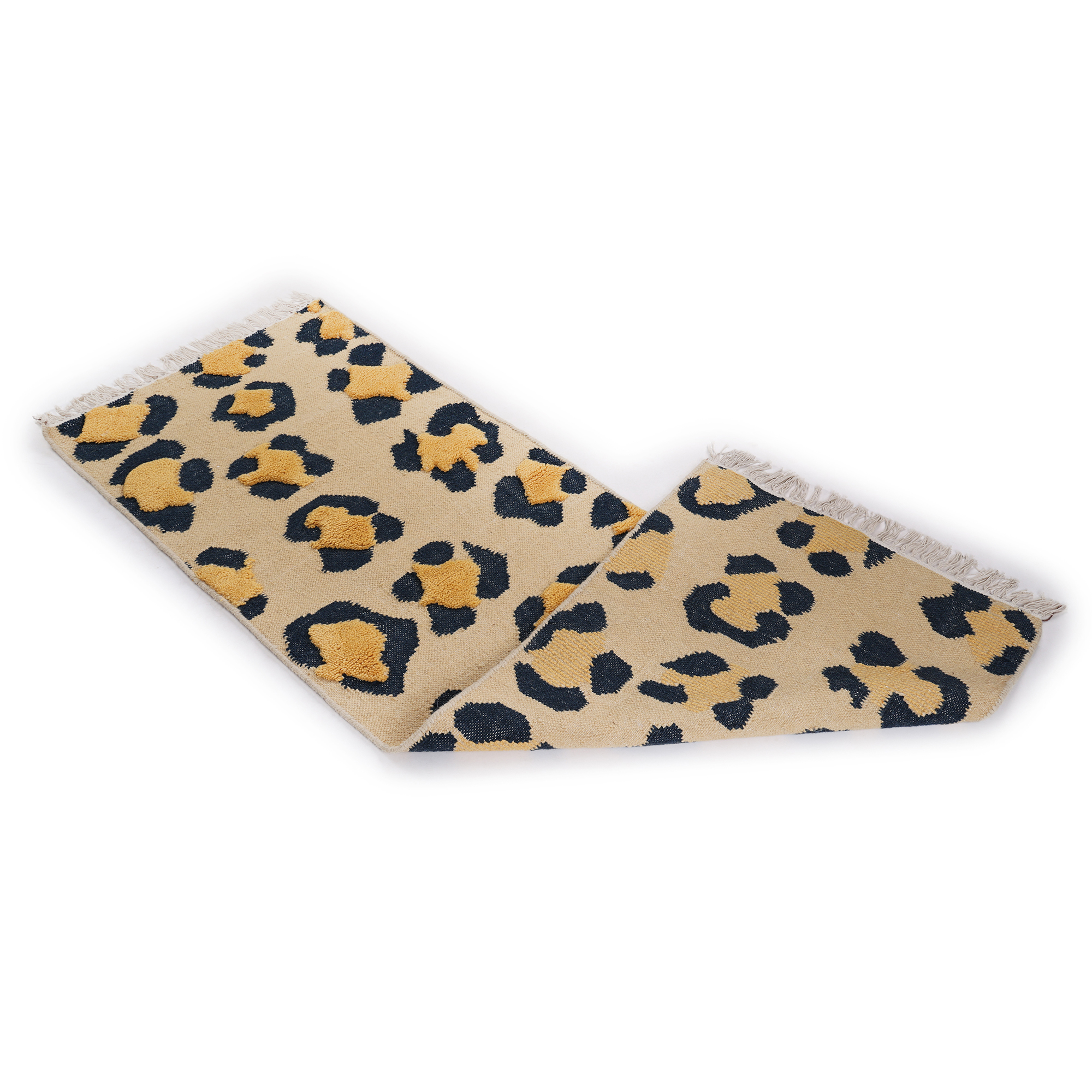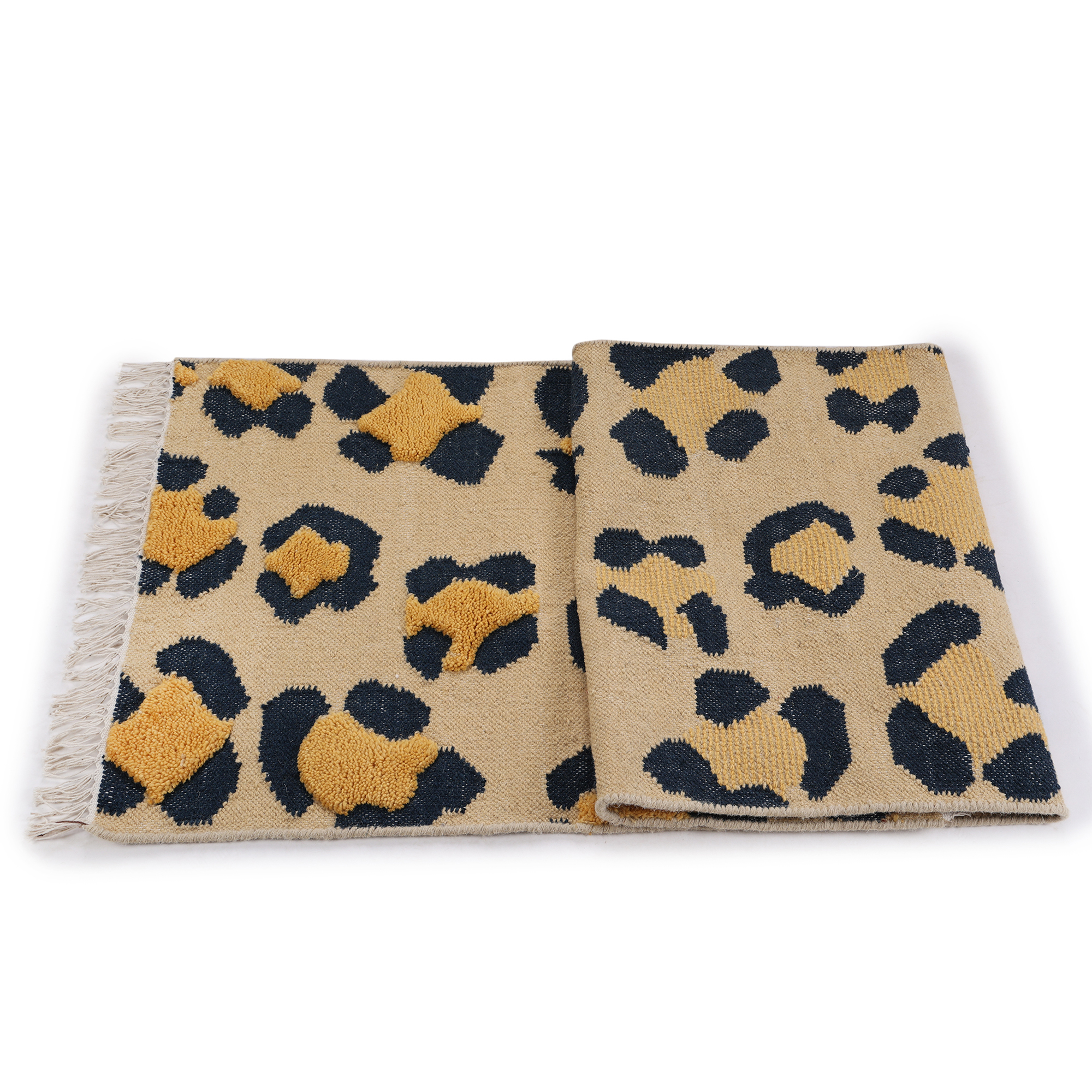 Step into the wild with this handcrafted rug, adorned with a leopard print that captures the essence of the untamed. The beige backdrop and intricate spots, framed by white fringes, make it a striking addition to any interior.