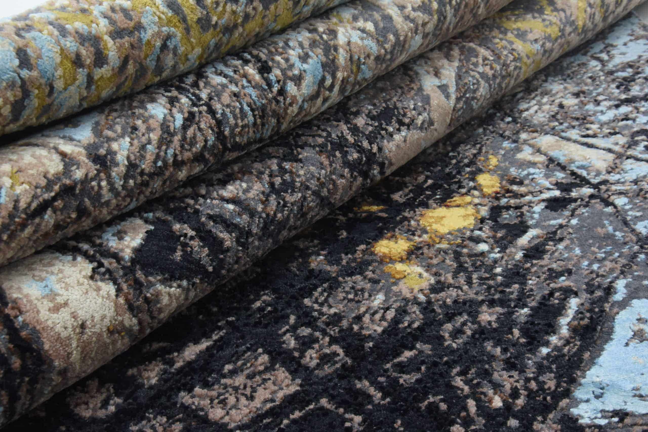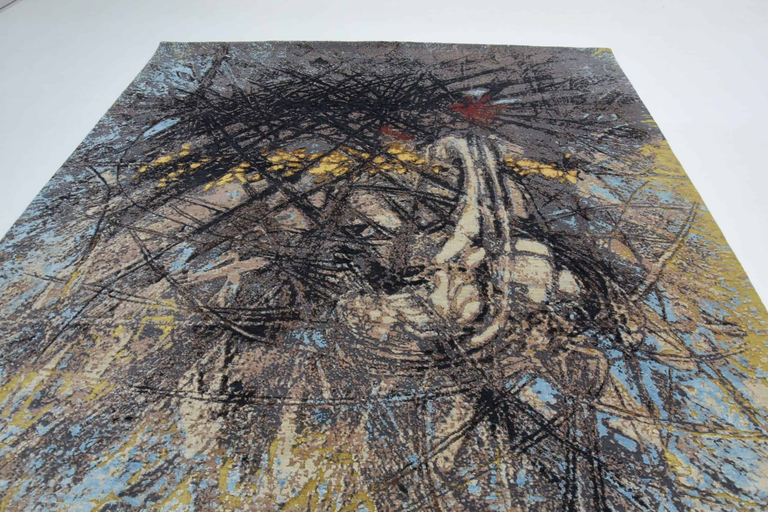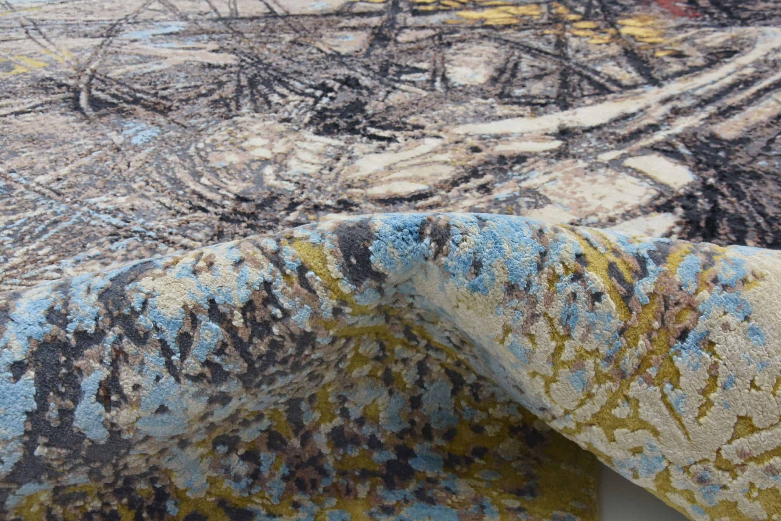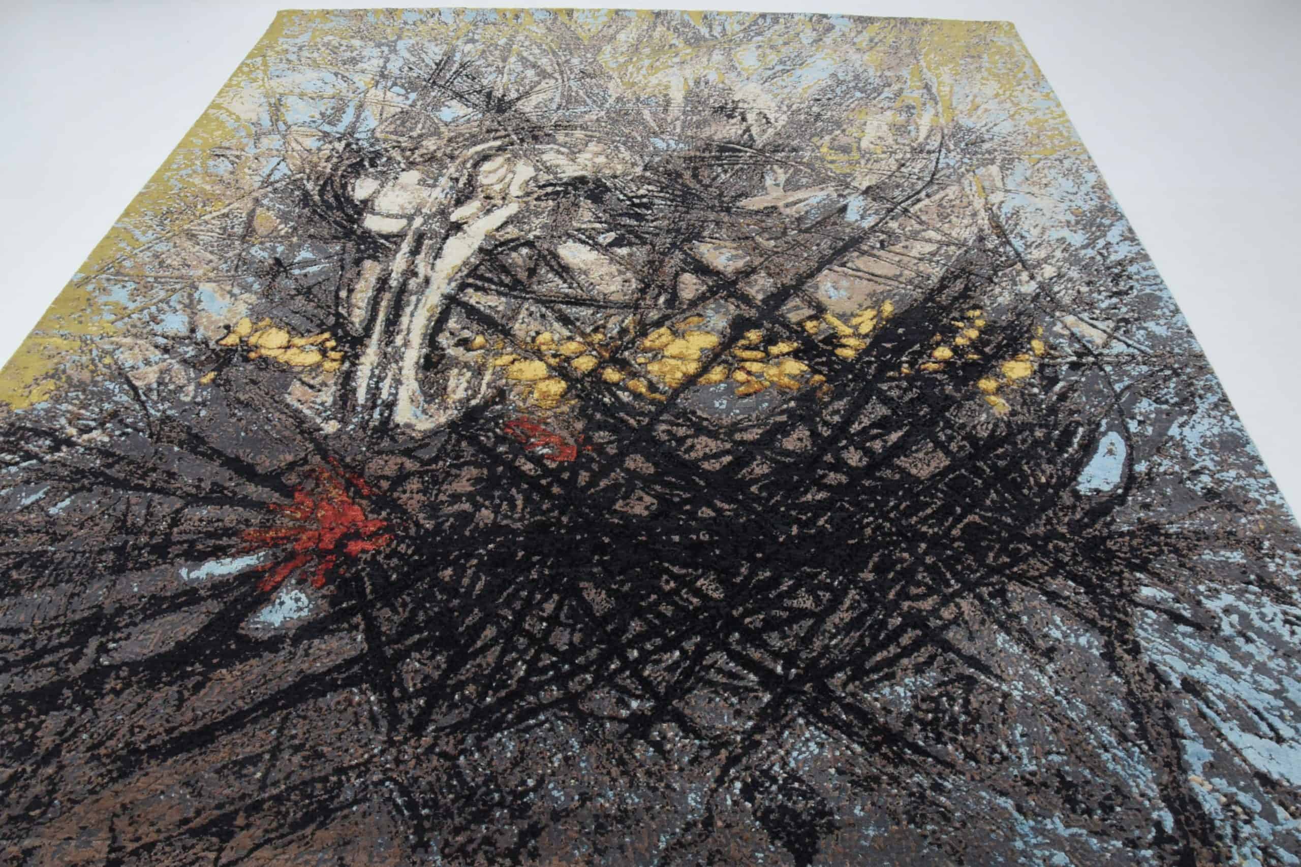 Mesmerise yourself and your lovely guests with this spectacular rug that reeks of artistic elegance with a variety of colours in aqua, ivory beige, strawberry red, mud brown and grey which can be seen scribbled across with black lines that make for memorable inspiration