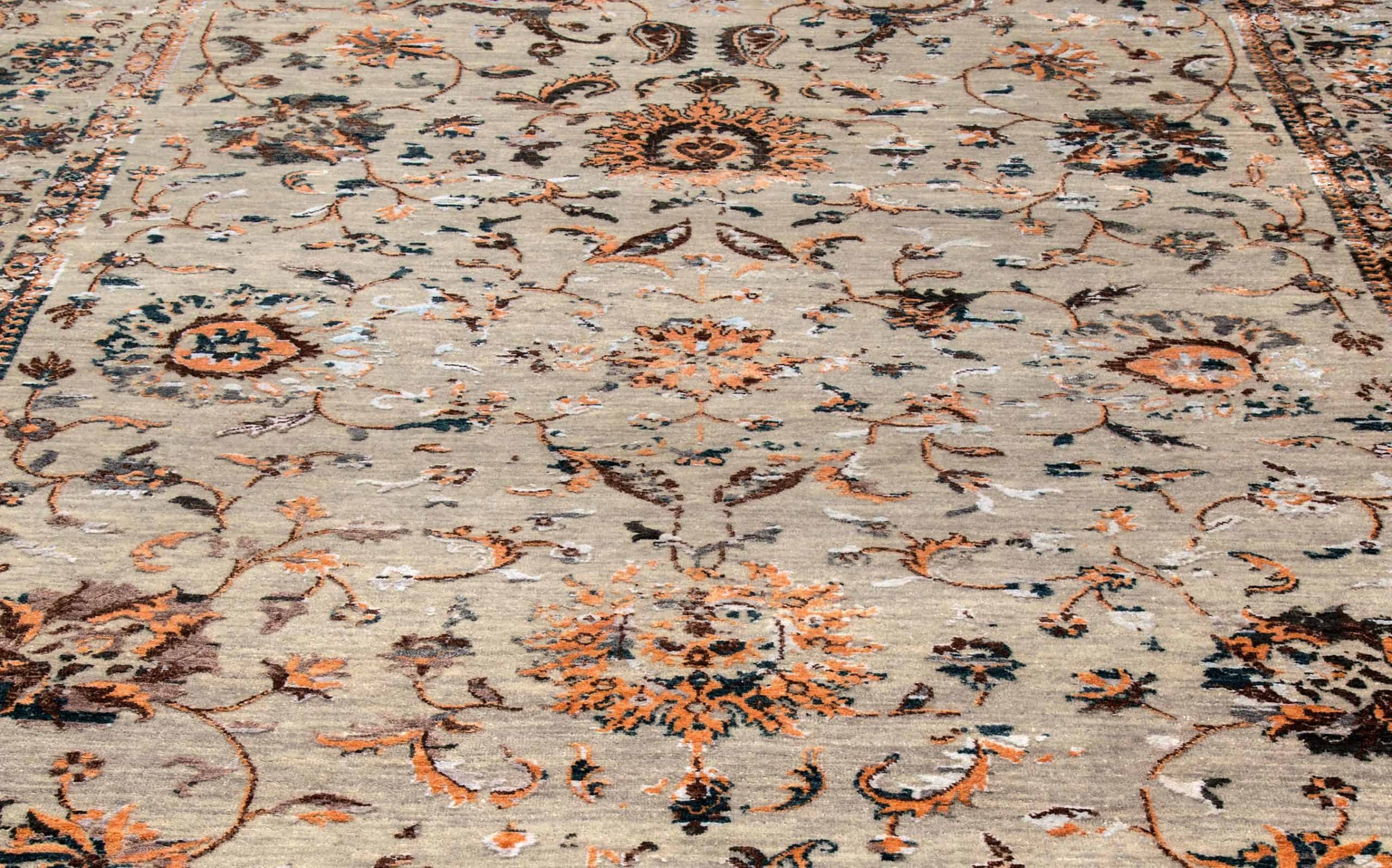 A mark of handmade excellence, the toned beige ground is brought to life with its sparkling white and multi-coloured Persian motifs partially woven on the surface