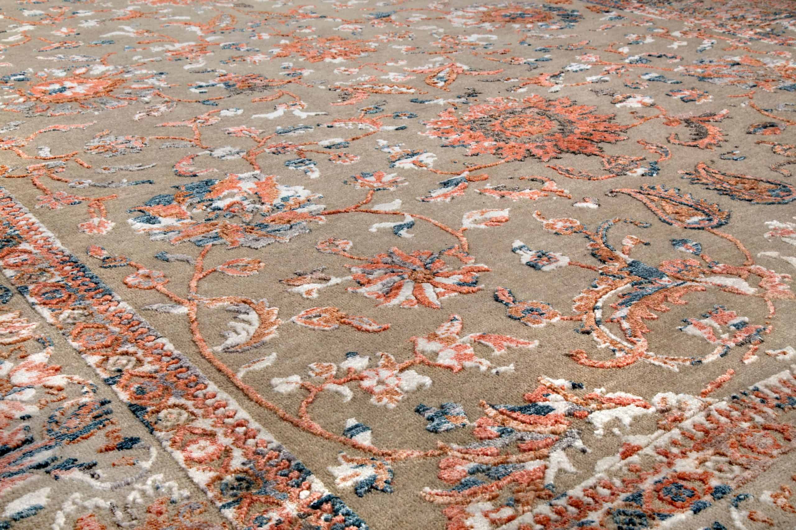 A mark of handmade excellence, the toned beige ground is brought to life with its sparkling white and multi-coloured Persian motifs partially woven on the surface