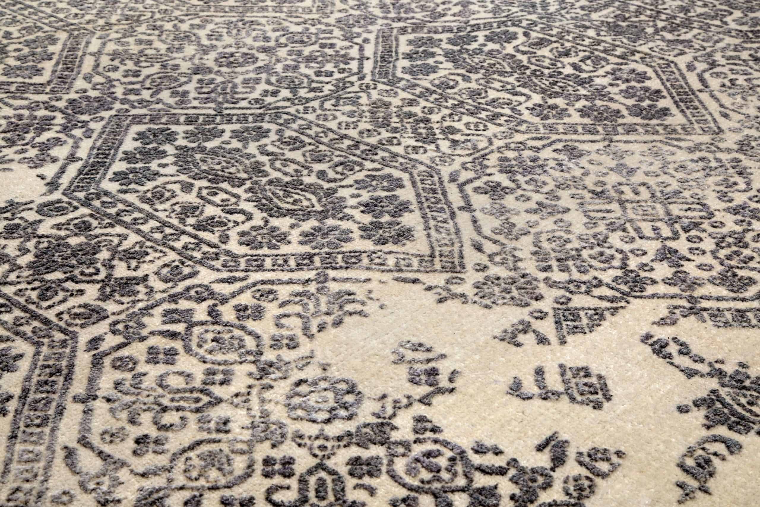 Mesmerise yourself and your lovely guests with this spectacular rug that is nothing short of a renaissance painting with its charcoal grey motifs partially carved on a sand beige background