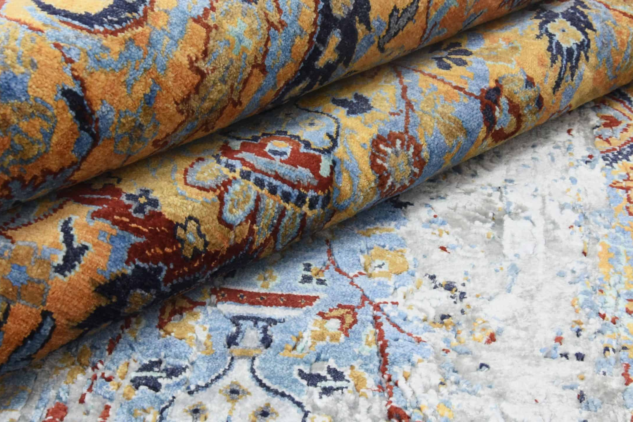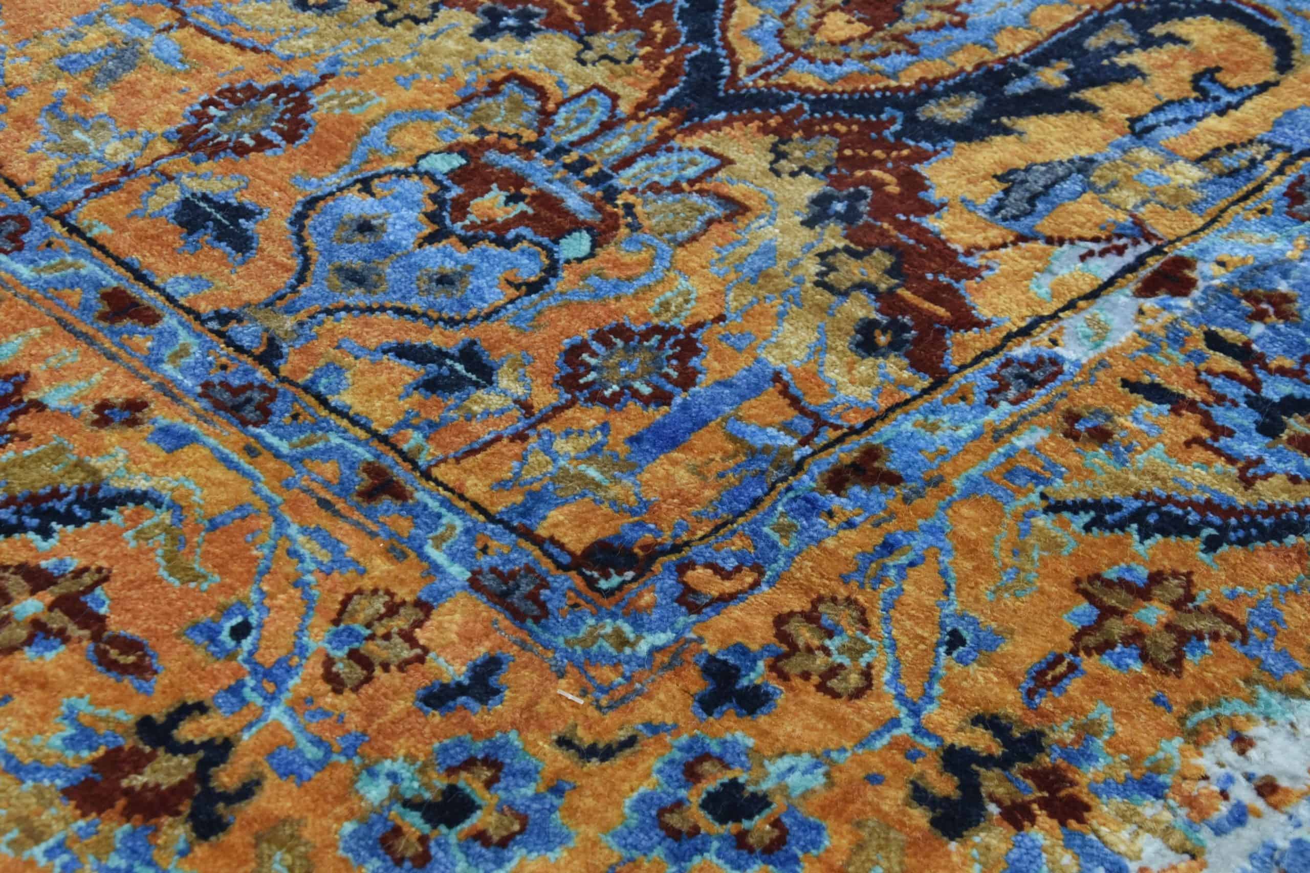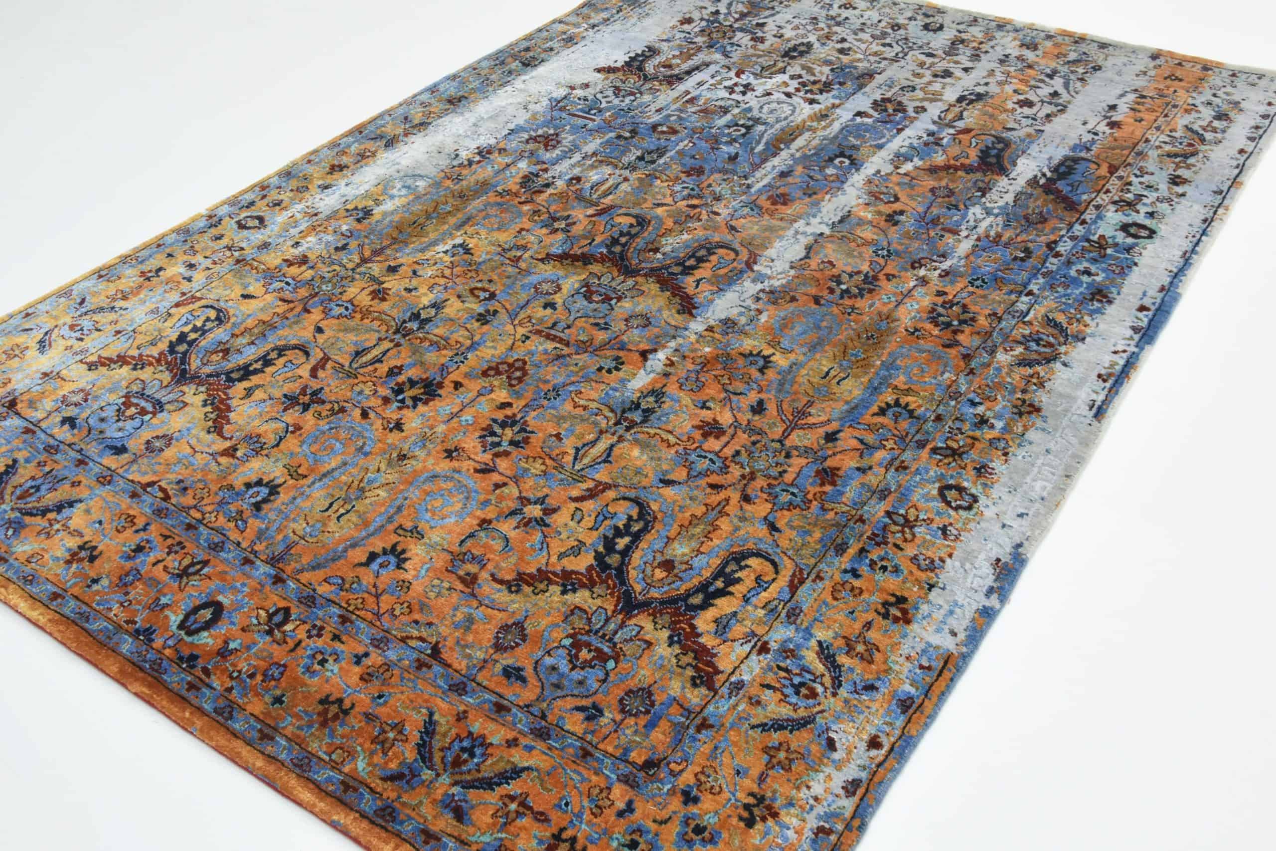 A mark of handmade excellence, the rust orange ground of the rug is brought to life with the traditional blue and burgundy motifs distorted by spilling some light grey shades