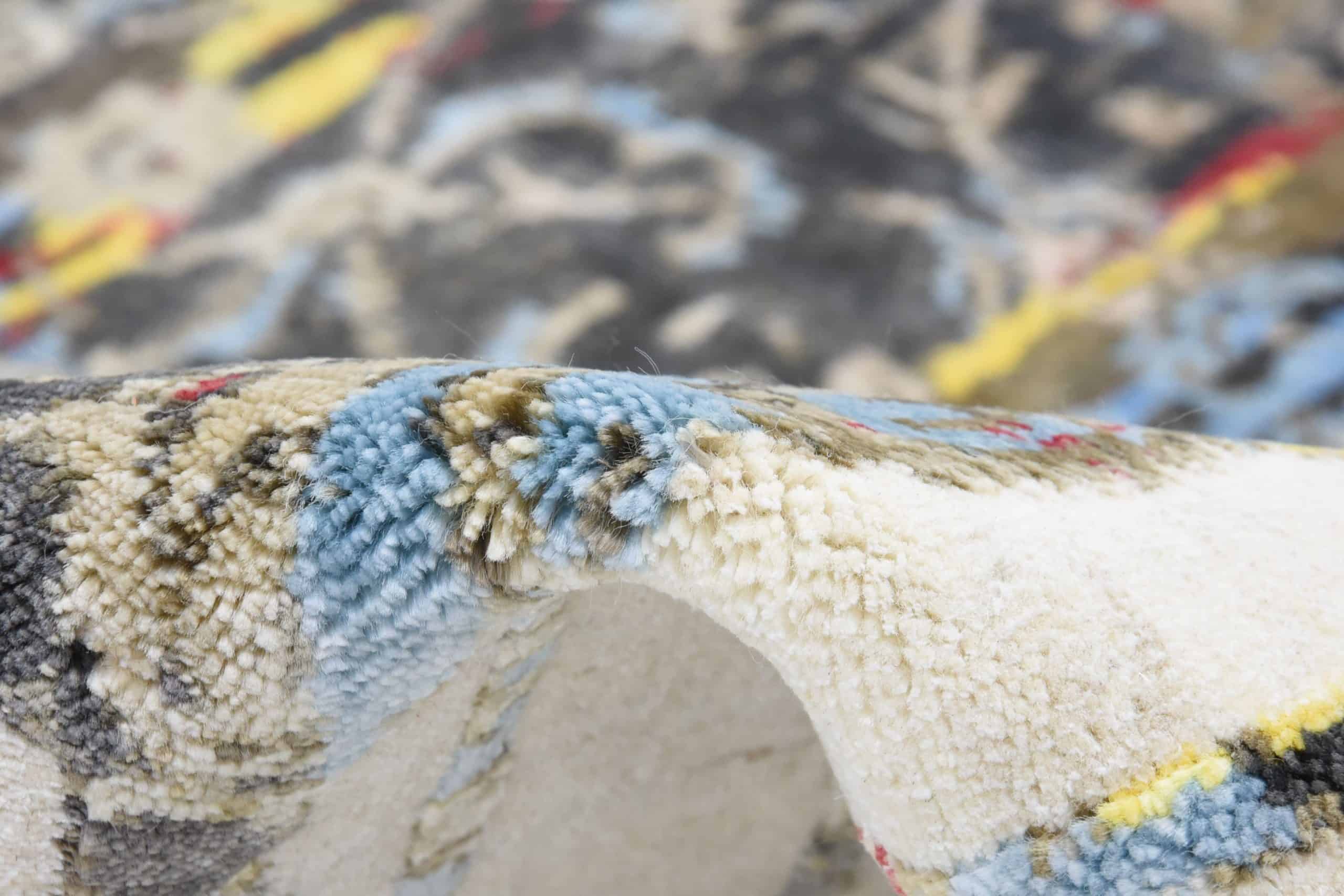 Combining a unique assortment of red, blue, yellow, beige and brown spilling over a canvas of ivory cream, the rug reflects tranquility taking over our lives like the journey your living spaces will embark on once this piece makes its way into your home